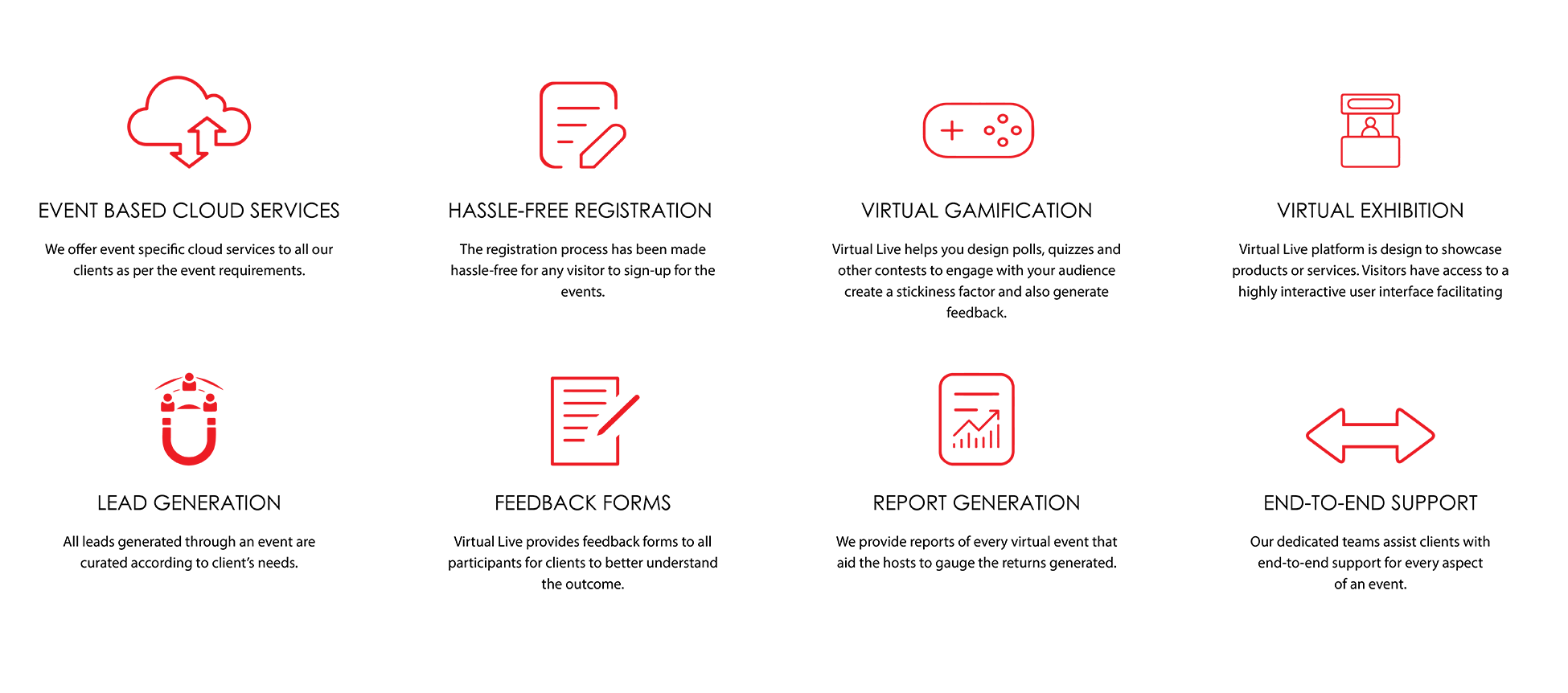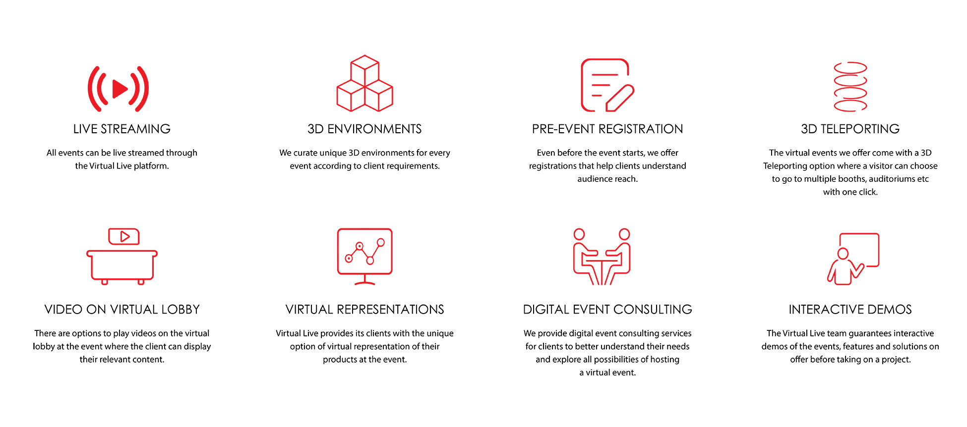 VirtualLive works with an aim to maximize an event’s ROI by helping our clients host engaging and professional virtual events. Be it a webinar, a conference, a workshop or even a wedding, we promise to curate all events from scratch to suit the client’s needs. Check out the wide array of solutions available at VirtualLive.