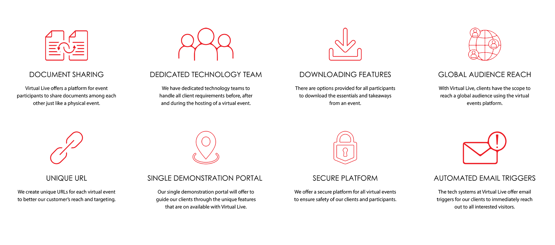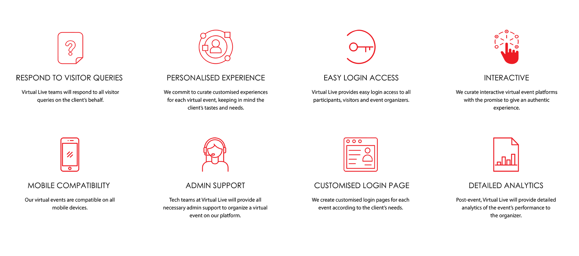 We strive to provide all-round holistic solutions to our clients with our virtual events that come with essential features such as end-to-end support, compatibility or easy access, along with features that are unique to VirtualLive. Browse through our features gallery to find our more.